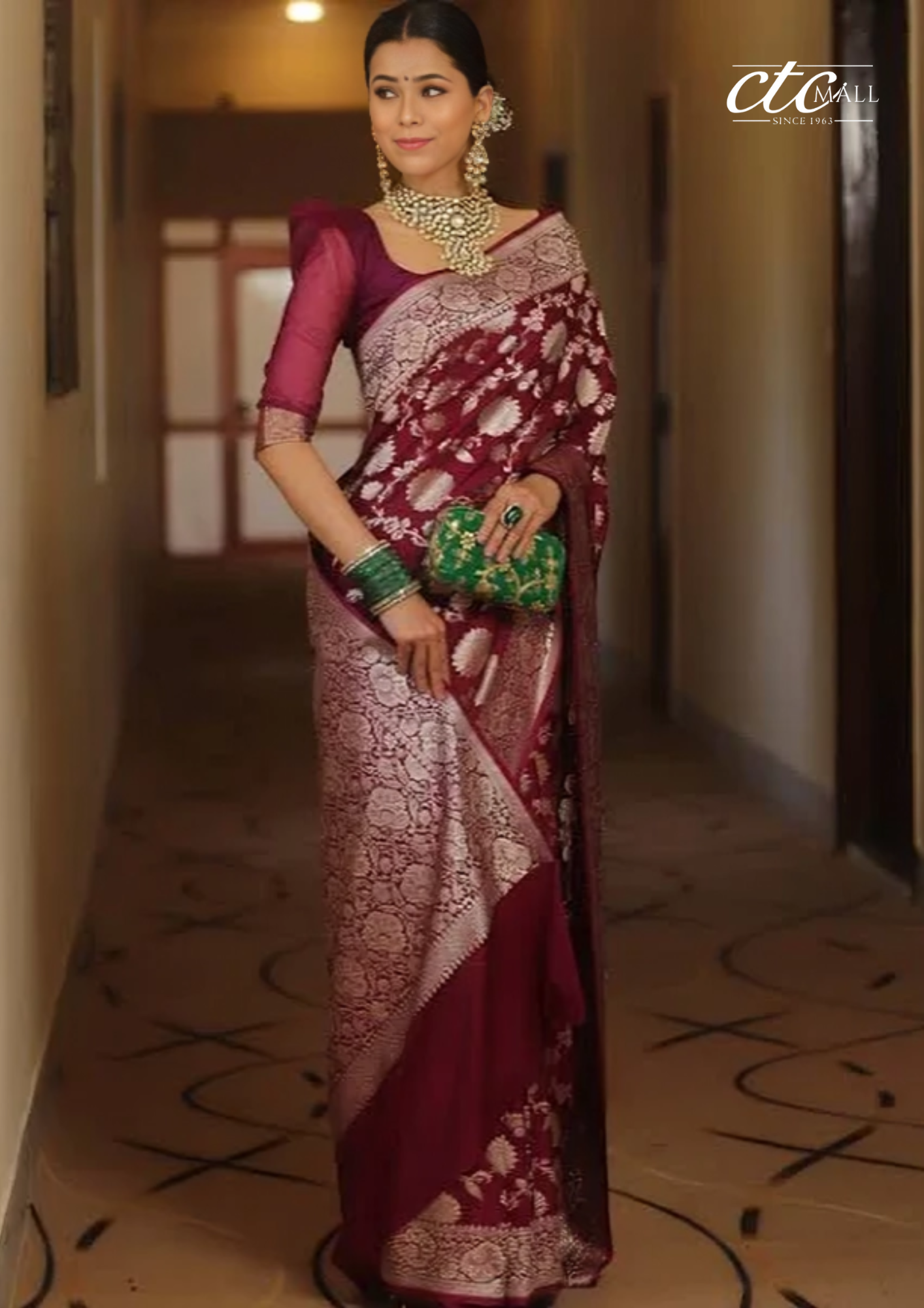 At CTC Mall, we proudly present our curated collection of Banarasi sarees, epitomizing the rich heritage and timeless elegance of Varanasi’s weaving tradition. Crafted from the finest silk, each saree showcases intricate zari work—gold and silver threads woven into elaborate floral, paisley, and geometric patterns. The luxurious fabric and meticulous craftsmanship make these sarees ideal for weddings, festivals, and other grand occasions. With designs ranging from traditional motifs to contemporary interpretations, our Banarasi sarees cater to diverse tastes, ensuring that every wearer experiences the regal charm of this iconic attire. Explore our collection at CTC Mall and embrace the opulence of Banarasi silk.